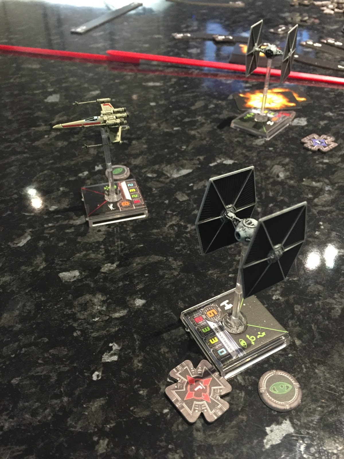 Our game included a lot of maneuvering, less shooting, and a few explosions.  It ended with the XWing with no shields, but both TIEs destroyed. The Obsidian pilot attempting a barrel roll into the path of the XWing for a shootout.