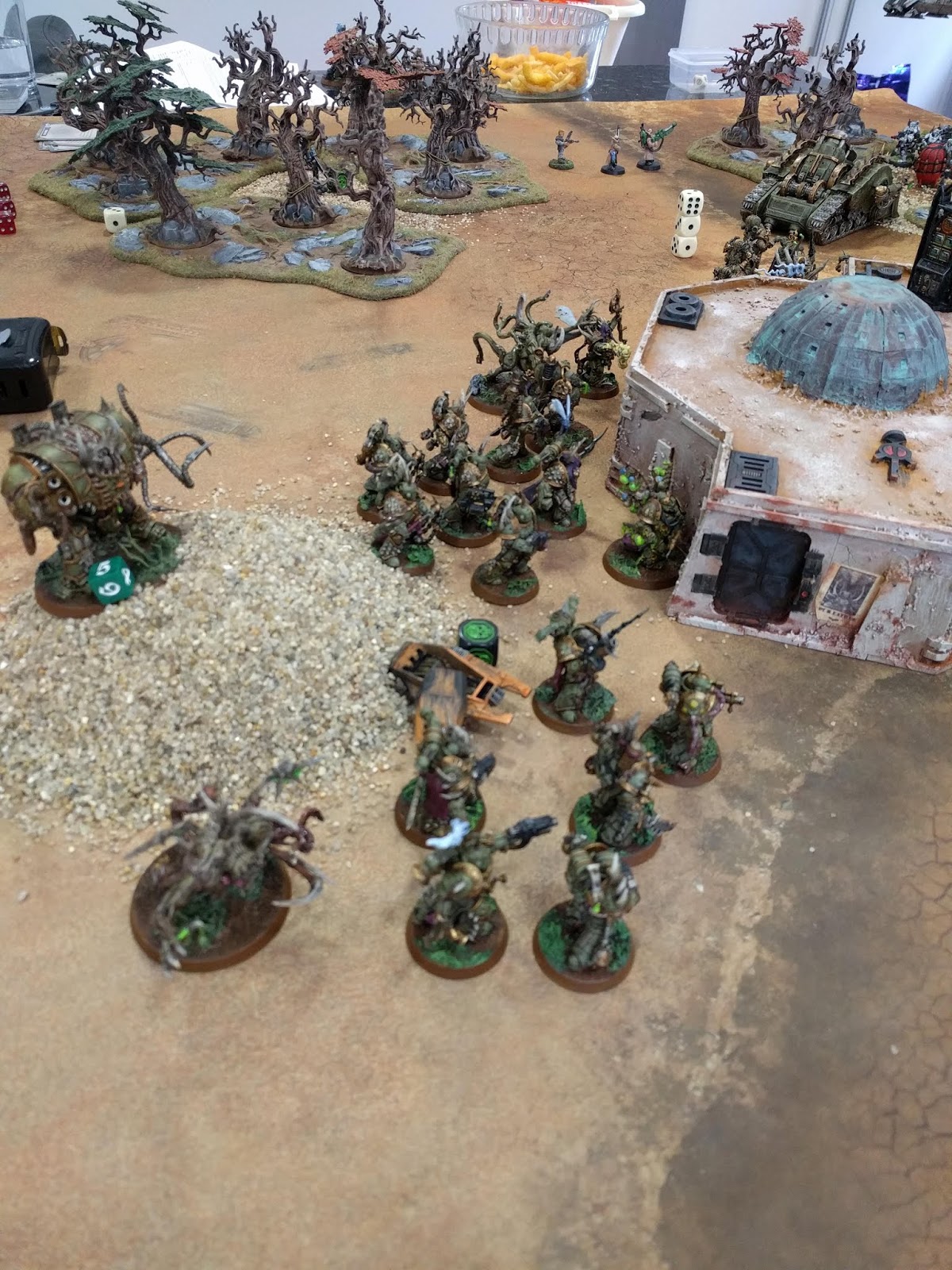 Fortunately, the random plague-flamer rolled only strength 5 and two hits this time. Either one didn’t wound or I rolled several saves/disgustingly resilient saves so my warlord was left alive – I’m sure he took a couple of wounds though. I think the sniping assassin fluffed his shot at the Blightspawn (second roll of 1 to hit for him in the game).