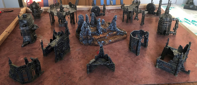 I've got a few newly painted units that I want to put into the list today. Top of the list is a Doom Scythe, which looks fantastic but could be brittle with T6 and no invuln save. More great-looking models are a Skorpekh Lord and three Skorpekh Destroyers; I'm sure these guys will be very effective (though two of the Destroyers have damage 2 weapons, which will be wasted against Disgustingly Resilient). I spend 2CPs to beef up the Lord, giving him the Nanoscarab Casket relic (he'll recover 2 wounds per turn instead of 1 from Living Metal) and the warlord trait Enduring Will (-1 damage from all attacks - appropriately mirroring Disgustingly Resilient). My warlord is an Overlord with the Szarekhan warlord trait The Triarch's Will (so he can pick the same Protocol twice) and I give him the Orb of Eternity to boost his Resurrection Orb to reanimate on 4+ once per game. I'm deliberately avoiding the fantastic Veil of Darkness relic this time to try a few other relics.
