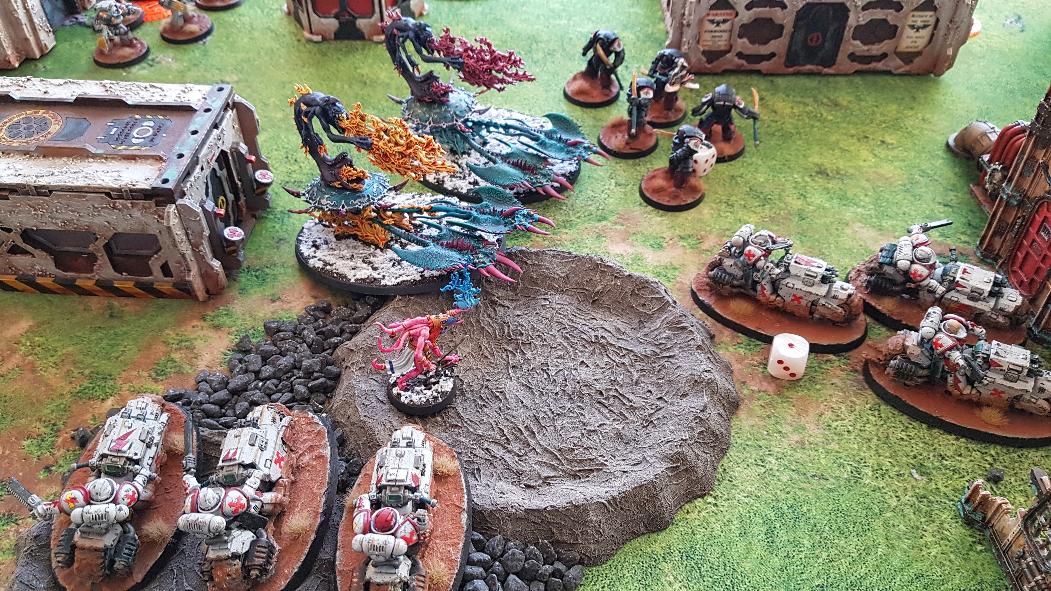 Linking up with them on the south flank are the Bike Khan and both squads of Outriders. The second squad of Incursors camp on the home objective and both Terminator squads go to the teleportarium.