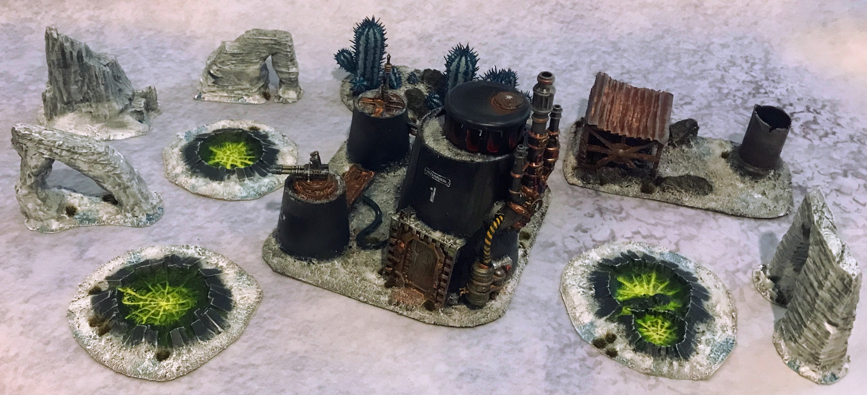 Those craters and the graffiti are doing a fine job of keeping it Necromunda. There's sumpy ick below the surface and delinquent juves with spray paint, even out here in the Wastes.